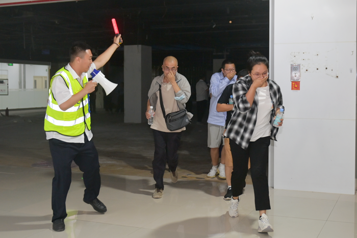 园区模拟突发火情。在第一时间发现“火情”后,园区立即启动应急预案,组织扑灭初期火情,组织人员疏散。整个过程训练有素,专业化程度高。