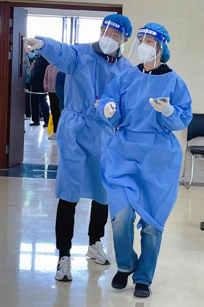 我所下沉的社区居民将近2600人,一般情况下排队20到30米,人多的时候队伍能有100多米长。社区分为两道核酸通道,一天一条通道能扫描1200至1300人左右。由于戴着防护面罩与口罩,说话声音并不是很清晰,为此我只能不停地重复着相同的提示,一天下来不仅嗓子沙哑了,汗水也浸透了全身。