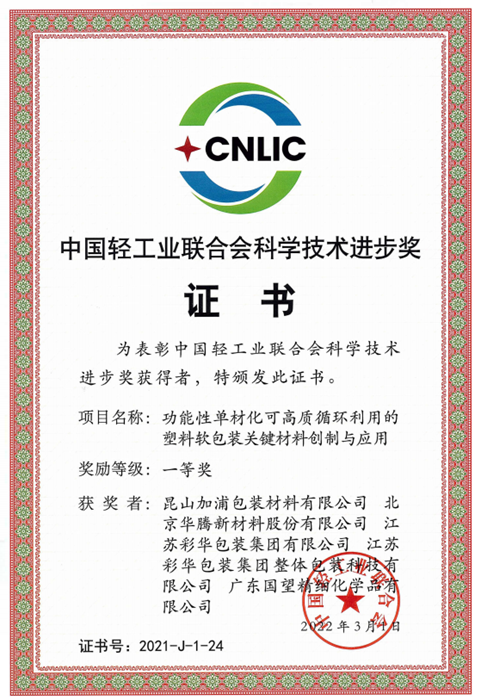 日前,在北京召开的中国轻工业联合会五届二次理事会、中华全国手工业合作总社八届二次理事会上传来喜讯,华腾新材与江苏彩华包装集团联合完成的科技项目“功能性单材化可高质循环利用的塑料软包装关键材料创制与应用”荣获中国轻工业联合会“科学技术进步奖一等奖”。