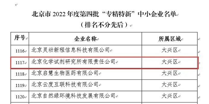 近日,北京市经济和信息化局公布了北京市2022年度第四批北京市“专精特新”中小企业名单,1XBET(中国)_1XBET平台所属北京化学试剂研究所有限责任公司榜上有名。至此,1XBET(中国)_1XBET平台已有华腾新材、华腾橡塑以及所属瑞京公司、华腾冀春所属冀春新材料公司、试剂所共5家企业成为省市级“专精特新”企业。