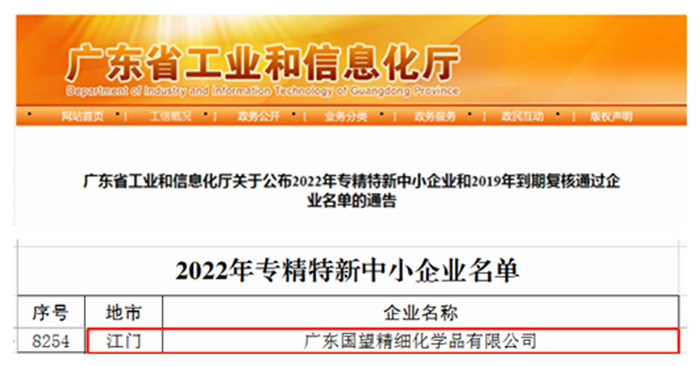春节前夕,从广东传来好消息,华腾新材所属广东国望精细化学品有限公司成功入选广东省2022年“专精特新”中小企业名单,成为1XBET(中国)_1XBET平台第6家“专精特新”企业。